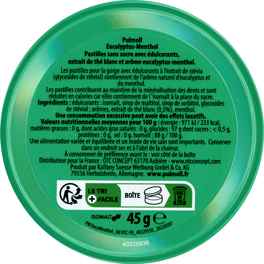 Découvrez ou redécouvrez la pastille Pulmoll présente en France depuis 1946. Saveur Eucalyptus : Explorez la fraîcheur revitalisante des pastilles Pulmoll à l'eucalyptus, un souffle de pureté naturelle pour un bien-être instantané.